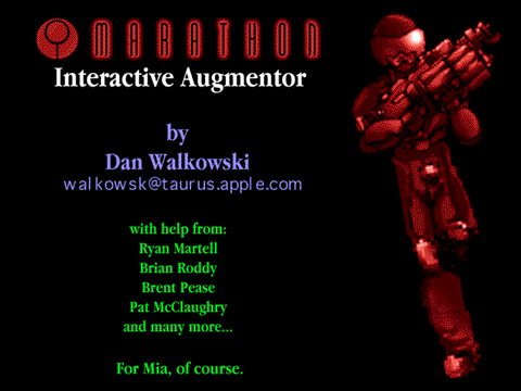 This is the last version (barring a huge bug) of Mia to be released for Marathon 1. There is a bunch of changes to the palettes and stuff, the most important being the addition of POPUP MENUS FOR TEXTURES, which I'm sure you will all be happy to see. I have stopped working on this version so that I can get a version up and running with Marathon 2 maps. I already have it mostly working, I hope to have it ready soon.
