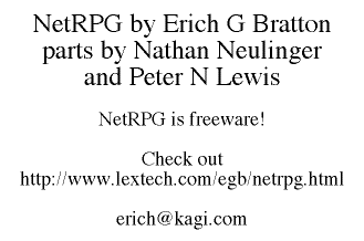 NetRPG is an internet server which lets a group of friends role-play over the net, with the players working together (or not) and a DM running the show. NetRPG allows players to talk with one another using a mud-like interface, ready weapons, set an armor class, have hit points, store online character sheets, calculate and run combats using initiative rolls, resolve attacks and distribute damage between players and monsters, store and retrieve ASCII maps to facilitate showing exactly where the action is occuring, roll dice either in the open or privately shown to only the player and DM, and allows the DM to fudge attack rolls when a plot line necessitates a critical hit or miss or whatever. All of these features (and more!) combine in NetRPG to make live internet role-playing not only possible, but very enjoyable!