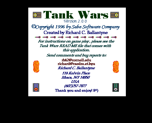Tank Wars 2.0.0 is finally available! Tank Wars is a futuristic battle simulation game between tanks. Play against the computer or another human player. The tank battles take place in an arena in post nuclear Las Vegas where other competitive tank drivers compete with each other. Whenever you win a battle with the computer player, you will be given a certain amount of money that can be used to buy power up items for your tank. The object of the game is to gradually gain money to buy items to upgrade your tank. When your tank is sufficiently powerful, you may attempt to defeat the final boss tank (Select "Final Boss" from the Difficulty Menu). BEWARE: The Final Boss is SMART and TOUGH! But if he is defeated you will find that the reward was well worth the trouble. Tank Wars is shareware - the fee is $5. Once the fee is paid, any program or upgrade I produce will be yours for FREE, plus I will send you a registration code that will make your tanks more powerful than you can possibly imagine.