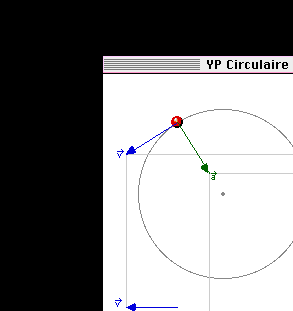 YP Circular is a physics simulation program for the Macintosh. It simulates an object in uniform circular motion and/or an object in simple harmonic motion. Both motions (circular and harmonic) may be animated simultaneously to show that the uniform circular motion is a combination of two simple harmonic motions. Physics teachers use YP Circular to show that the velocity is tangent to the circle and that the centripetal acceleration is directed toward the center of the circle, in a uniform circular motion. Physics students using YP Circular should get a better understanding of the meaning of the following concepts: vector, component of a vector, position, velocity, acceleration.