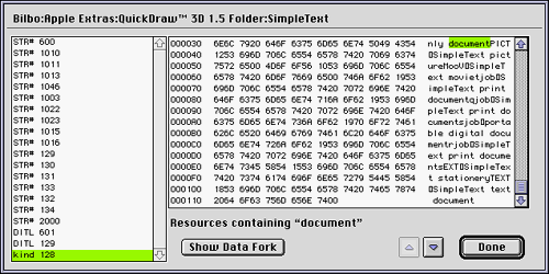 Fork type (resource fork, data fork or both) Resource name Resource type Resource ID Hex- or ASCII-strings