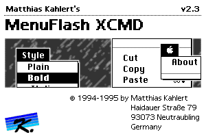 It let's you change the number of times a menuitem is flashing when you select it. This XCMD is accelerated for PowerPC (only for HyperCard >= 2.3). Also a version for 68K Machines is included.