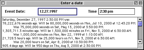 For example, enter the date the first Macintosh was announced: Jan 24, 1984. You will find that the Macintosh is now 518,303,291 seconds old and will be 550,000,000 seconds old on Friday, June 29, 2001.