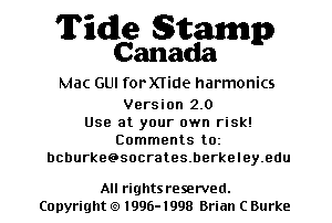 Tide Stamp is a tide and current predictor. Tide Stamp Canada calculates tides or currents for over 1000 Canadian locations. Tide Stamp will run on any Mac with System 7 or later. Version 2.0 fixes all known bugs in 2.0b and is valid thru 2000.