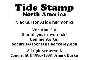 Tide Stamp is a tide and current predictor. Tide Stamp North America calculates tides or currents for 900 locations on or near North America. Tide Stamp will run on any Mac with System 7 or later. Version 2.0 fixes all known bugs in 2.0b and is valid thru 2000.