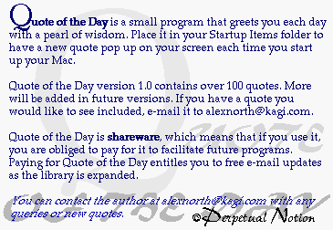 Quote of the Day is a simple shareware program that, when placed in your Startup Items folder inside your System Folder, will greet you each day with a random quote from a list including humorous, motivational, famous and business quotes.