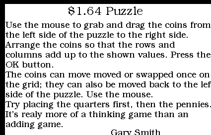 Description: Middle School level math program. Students must place four quarters, four dimes, four nickels, and four pennies on a 4 by 4 grid so that the rows and columns sum to given values. The program generates hundreds of problems on two levels of difficulty.