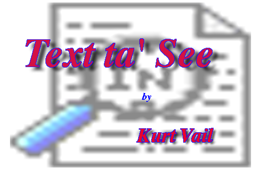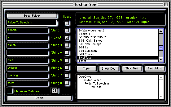 Text ta' See - is a text searching program that can search text files for up to 8 different words/phrases at a time. Once located Text ta' See arranges files found in descending order by the number of matches each file had and reports the full path to the file plus other pertinent information ie, creator, size, date modified and date created. Text ta' See will also display snippets of text showing the context in which the search string was used. To further narrow the search Text ta' See allows one to search the found set of files by a new set of words/phrases.
