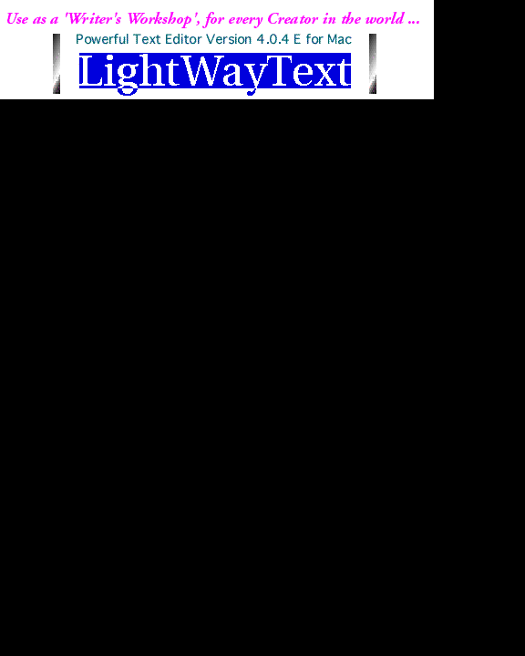 LightWayText (Shareware price US$25) is a powerful Text Editor having lots of nice features ! With LightWayText, you have all the power you expect from a full-featured word processing program - writing, editing, printing, and saving the text document in other formats including Kanji/PICT/JPEG. We have changed the idea of a 'Writer's Workshop' into a reality. We are glad if it lets you recall 'Macintosh mind of the early days' - The original Mac's concept was to keep it pure and simple and this we have done with LightWayText. We sincerely hope LightWayText will serve you well, being a good friend for your Mac...