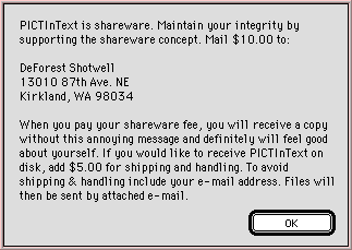 PICTInText is an utility that you can use to embed PICT files in your SimpleText documents. PICTInText will use any PICT file to create, number and install the necessary PICT resource into your text file without the need for a graphics application (Photoshop, GraphicConvertor, etc.) or the need to use ResEdit. Works wonderfully with screen captures. It does it simply and effectively in 5 simple steps.